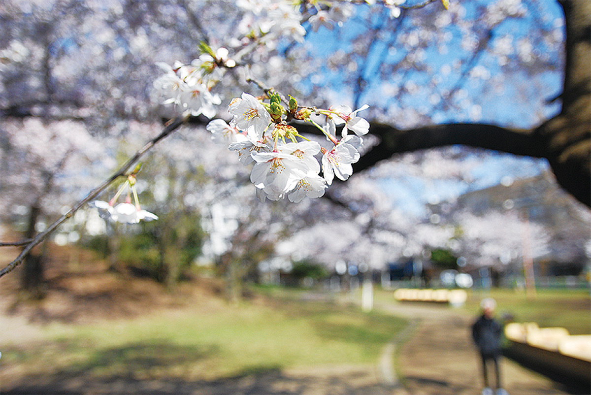 梶ヶ谷第1公園では、4月2日、早朝から一面に咲く桜を見上げながら散策する人が見られた。散歩が日課だという男性は「やっと晴れた。朝が一番きれい。週末まで楽しめそう」と話した。