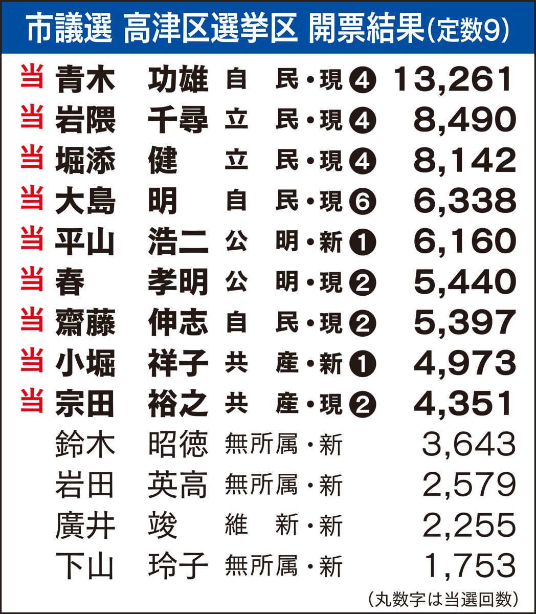 現職と新人が入り乱れ、接戦となった市議選。結果的に安定した選挙戦を展開した青木功雄氏(自民)が4期連続のトップ当選。次いで岩隈千尋氏(立民)が票を伸ばし4回目の当選を果たした。さらに堀添健氏(立民)、大島明氏(自民)が入り、平山浩二氏、春孝明氏の公明両氏が続いた。春氏の得票数とほぼ差がなく齋藤伸志氏も当選を果たし、自民3議席目を死守。小堀祥子氏、宗田裕之氏の共産両氏が最後の2議席に滑り込んだ。