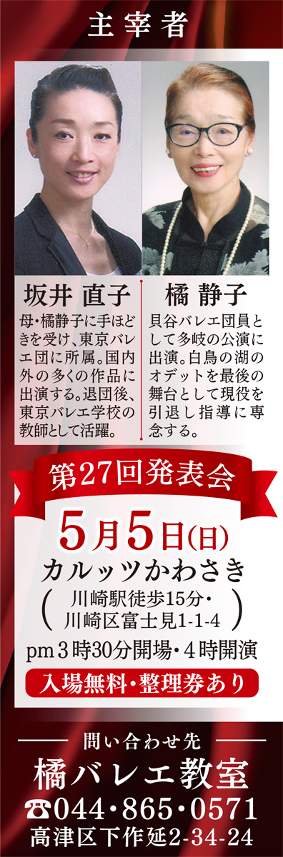 今年、創立55年を迎える橘バレエ教室(下作延)が5月5日、「カルッツかわさき」で第27回発表会を開催する。入場無料。