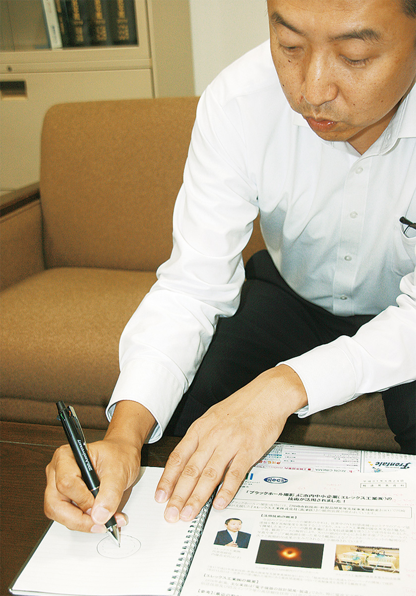 電子機器の開発・製造を手掛ける同社は、普段は情報インフラを支える高速伝送技術等で数々の実績を挙げ「川崎ものづくりブランド」の認定を受けるなど、地元はもとより業界内でもパイオニア的、といった存在。とりわけ「電波天文観測」というジャンルでは国内屈指の開発力を持っており、従業員34人という中小企業ながら国家的プロジェクトにも常々参画してきた。国立天文台とタッグを組み、長年挑んできた「ブラックホールの撮影」もその内の一つ。