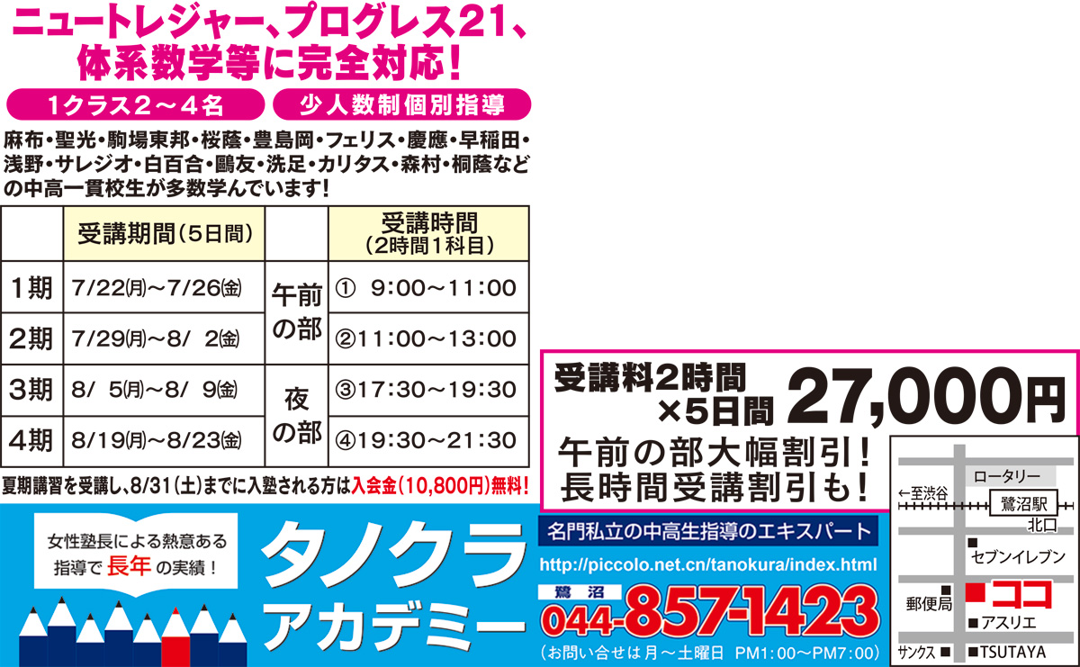 鷺沼で40年以上の実績を持つ私立中高一貫校生の英語・数学専門塾「タノクラアカデミー」が、夏期講習の申込みを受け付けている。