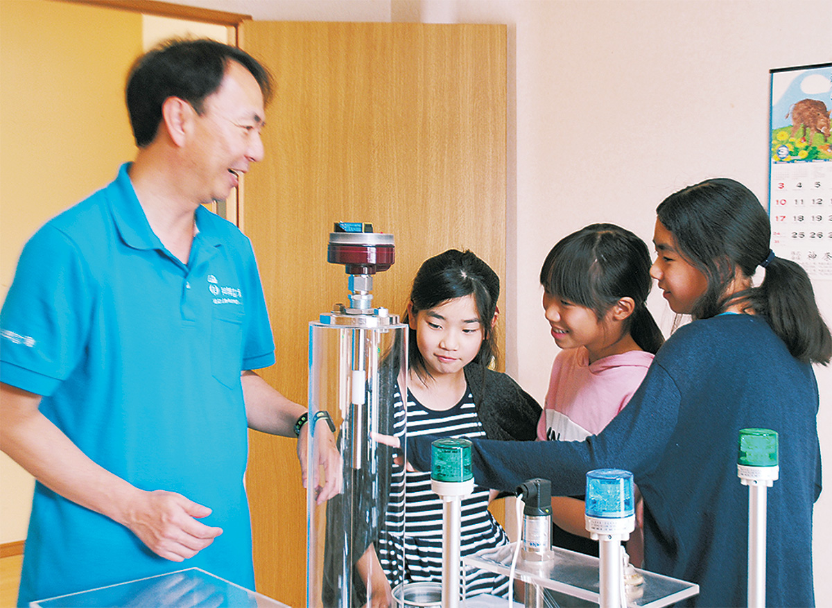 参加企業の1つ、病院などで使用されている液面計測器を製造する(株)和興計測は、超音波を使ってスイッチが反応する仕組みなどを解説。センサーに手をかざすとスイッチが光り、体験した子どもたちは驚いた表情で青と緑のスイッチを見つめた。