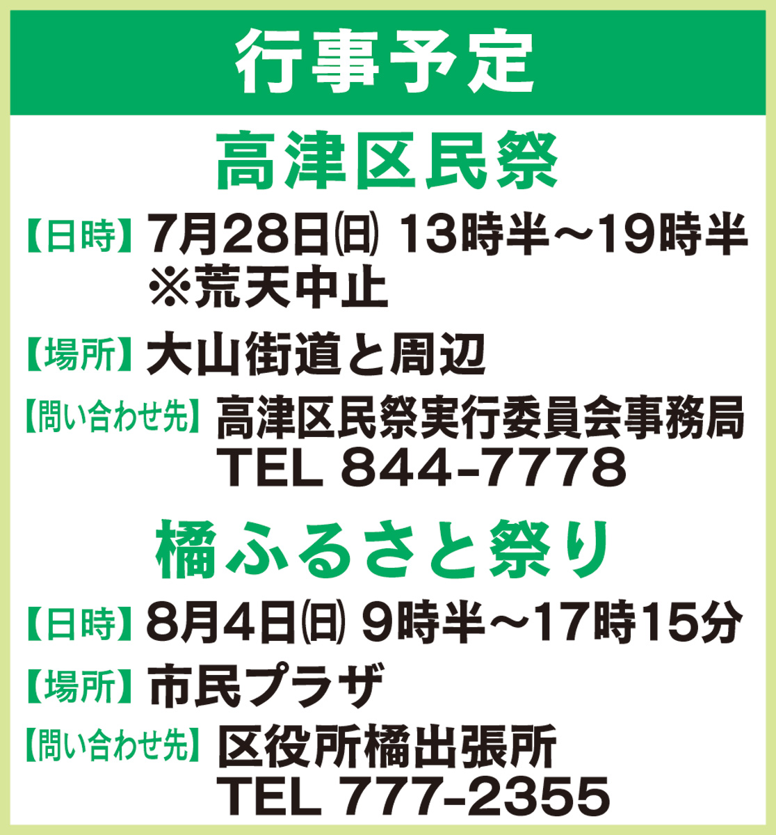 夏というと、思い浮かぶのは「お祭り」です。今年も高津区では、七月二十八日に高津区民祭が、八月四日には橘ふるさと祭りが開催されます。また、町内会・自治会ではそれぞれ、盆踊りや納涼祭が開催されます。夏を彩るお祭り、来場者の方にすてきな思い出ができることを願っています。