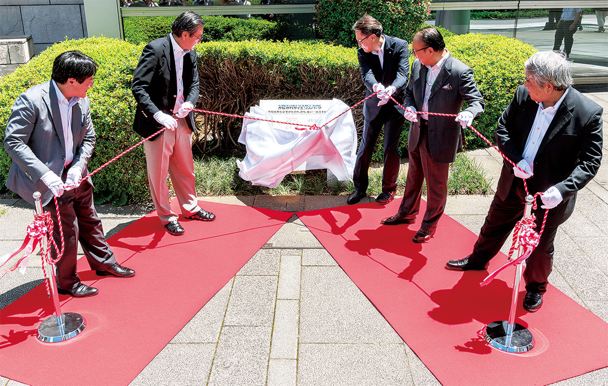 当日、午前11時半から開かれた「記念碑除幕式」には株式会社ケイエスピー代表取締役社長・内田裕久氏をはじめ管理会社や商店会などのKSP関係者が出席。施設開設30周年のモニュメント設置に際し内田社長は、これまで長きにわたり同所に協力を惜しまなかった周辺住民に深い感謝の意を述べると共に「(国内初の研究開発施設として)今後も共に歩んでいければ」といった主旨の挨拶。その後、関係者4人と一緒に除幕を行い、晴れやかな表情をみせていた。