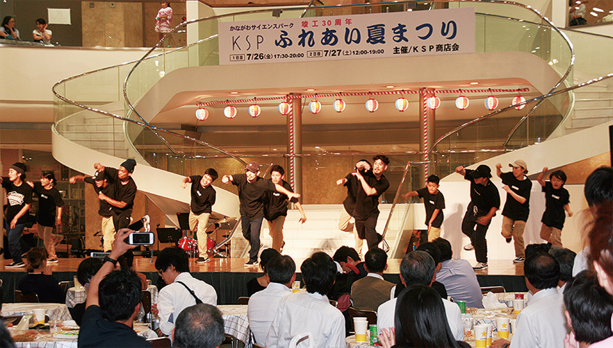 また毎年恒例となっている「KSPふれあい夏祭り」も記念の節目に相応しく特別プログラムに。地元・溝口で育った世界一のブレイキンチーム「フローリアーズ」が、特設ステージの目玉として登場し、キレのあるブレイクダンスを披露。お祝いムードに一風変わった華を添えていた。