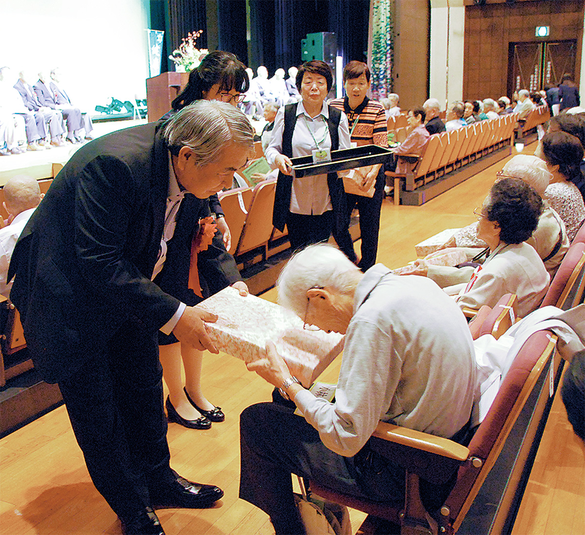 9月16日の敬老の日を前に、高津区社会福祉協議会が区内の満90歳の人に祝い品の贈呈などを行う敬老会が高津市民館大ホールで行われた。