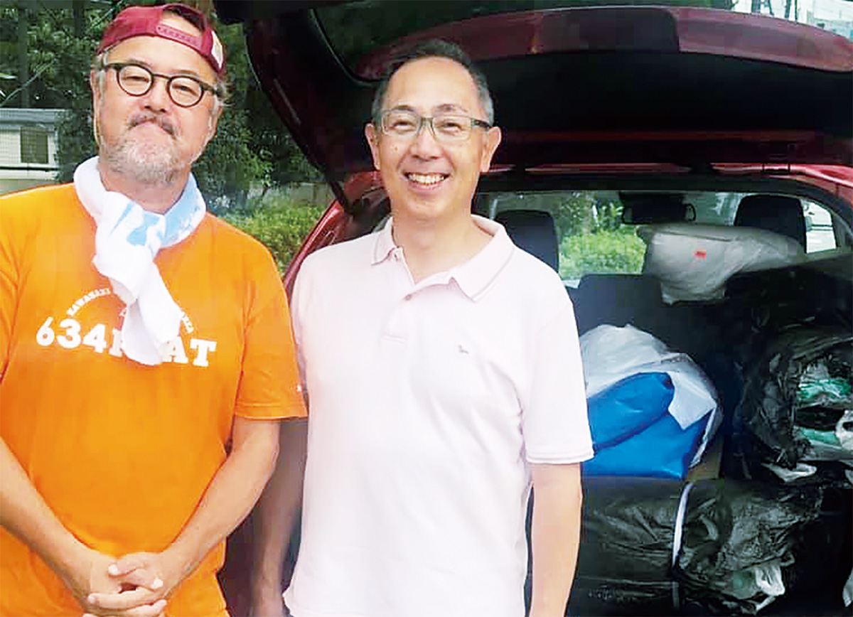 「被災地へ土のう袋を送るプロジェクト」に携わり、建築業を営む西山さんは山本さんの相談を受け、ブルーシートを押さえる土のう袋約700枚をはじめ家屋復旧に必要な資材を収集。土のう袋は、昨年の西日本豪雨後に集めた約300枚も含まれ、これらには以前から被災地支援に取り組む市立南生田中学校(多摩区)の生徒が励ましのメッセージや挿絵を描き込んでいる。
