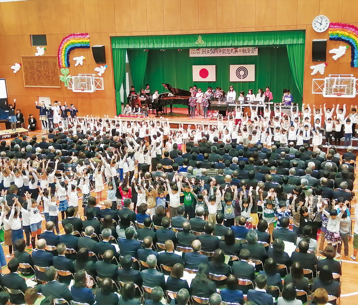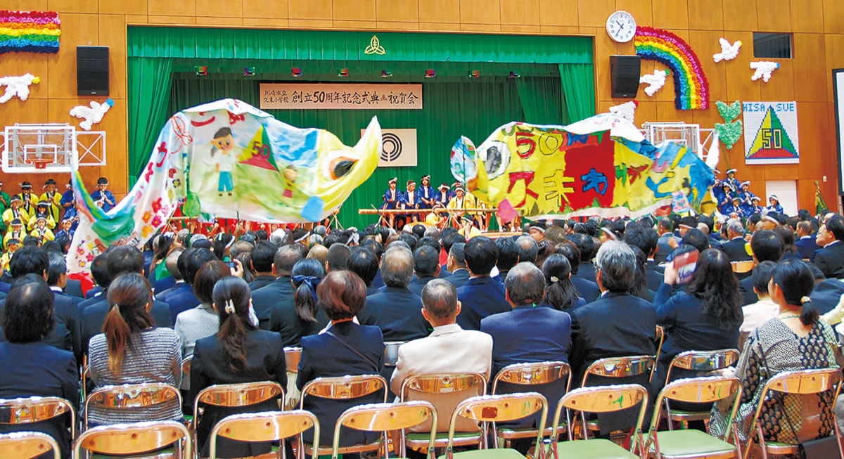 久末小学校は創立50周年を前に「ゆたかな緑 かがやく笑顔 未来にはばたく 久末小」という合言葉の下、約2年前から式典に向けての準備等に着手。当日は図書委員会による「久末誕生物語」で幕を開け、50周年テーマソング「WAになっておどろう」の披露で会場は一気にヒートアップ。その後、司会を務める運営委員メンバーが扮する同校オリジナルキャラクター「ベジタブルズ」による楽しいトークを交えつつプログラムは進行。各学年ごとにダンスや合唱、群読などを披露した。児童の熱演の合間を縫うように、来賓の挨拶なども恙無(つつがな)く執り行われ、エンディングでは50年分の感謝の意をこめ上級生が「いのちの歌」を熱唱。1時間半にも及ぶ式典は感動のフィナーレを迎えた。