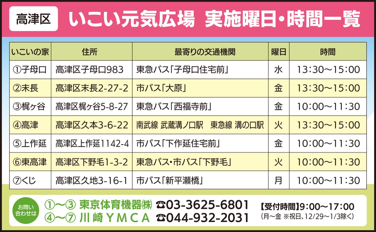 対象は、市内在住で川崎市住民基本台帳に登録されている 65 歳以上で、【1】医師から運動を禁止されていない【2】要介護1〜5の認定を受けていない人。持ち物は、タオルと飲み物。予約、申し込み不要、直接各会場へ。