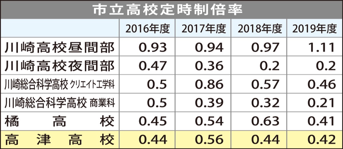 神奈川県内の公私立高校は2006年から、希望者の多い全日制への進学実績を高めようと取り組んできた。その影響もあり、市内定時制の入試倍率は年々低下。区内・久本にある高津高校をはじめ川崎高校(川崎区)、橘高校(中原区)、川崎総合科学高校(幸区)ともに過去4年間定員割れが続いている。