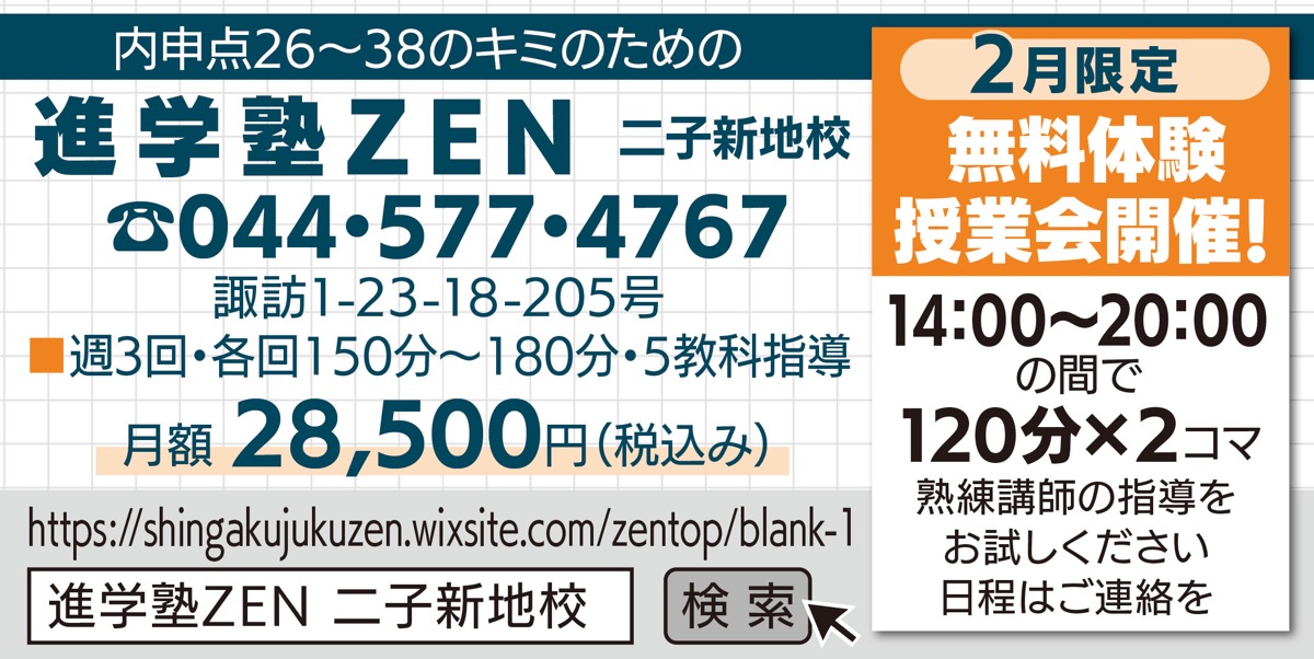 高校受験を来年に控え、成績をもう1ランク引き上げたい―。そんな家庭に訪れてもらいたい塾がある。二子新地にある高校受験専門「進学塾ZEN」は、評点『3から4』、または『4から5』へ成績を引き上げることに定評がある。