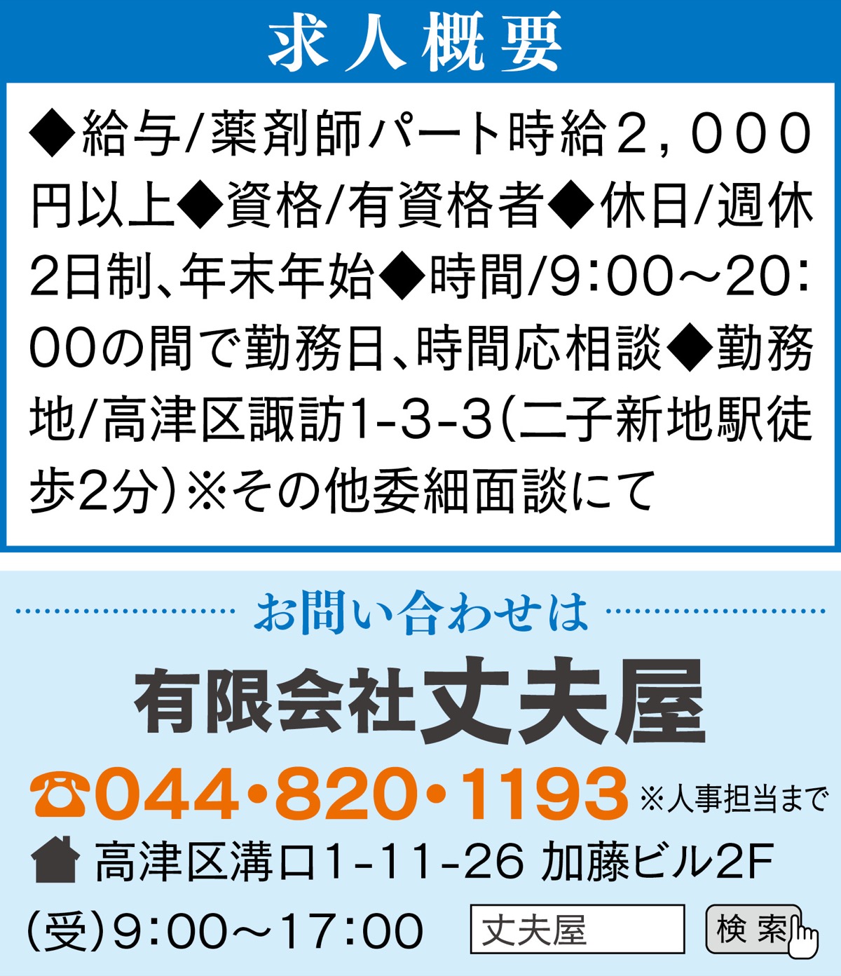 区内で薬局、介護事業所、薬配達サービスを展開する(有)丈夫屋の11店舗目、二子薬局新地店が先月、二子新地駅すぐ近くにオープンした。