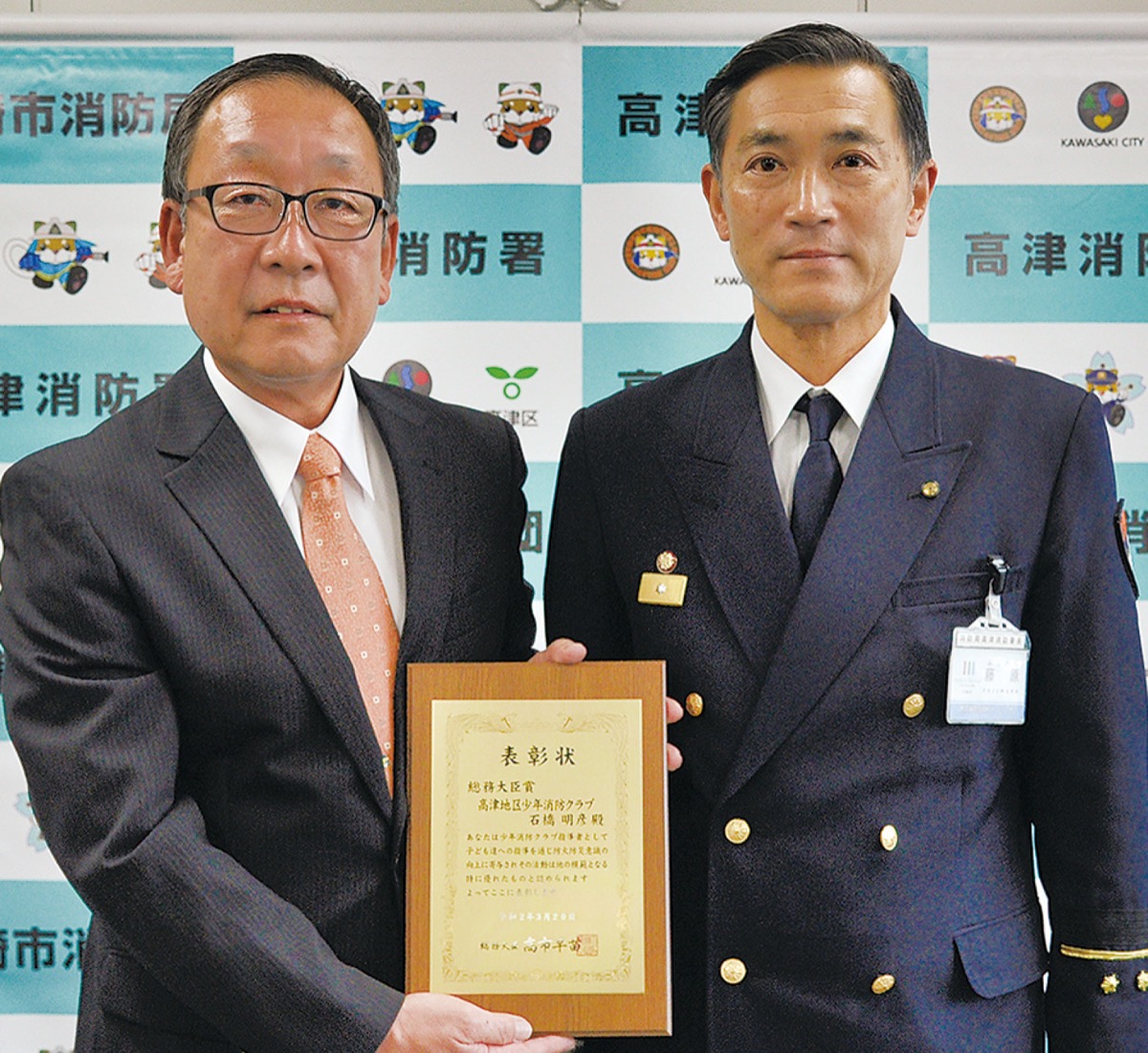 高津地区少年消防クラブの運営委員長を務める石橋明彦さん(下作延在住)が優良な指導者に贈られる総務大臣賞を受賞し、3月31日、高津消防署で伝達式が行われた。少年消防クラブ指導者が総務大臣賞を受賞するのは区内初。
