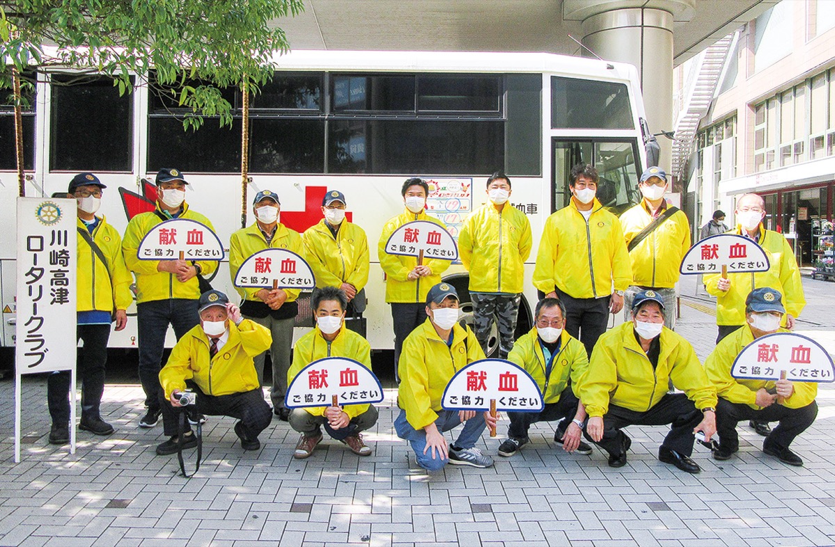 高津区内を中心に奉仕活動を行っている「川崎高津ロータリークラブ」(福嶋徹会長)が7月25日(土) 溝口駅前(東急ストア前)で献血活動を実施する。これは今年「高津区民祭」の中止を受け、献血活動を強化するという方針の一環。当日は、日本赤十字社から献血バスが来場し、黄色のジャンパーと青色のポロシャツを着た同クラブメンバーらが協力を呼びかける。献血に協力した人には粗品を用意している。