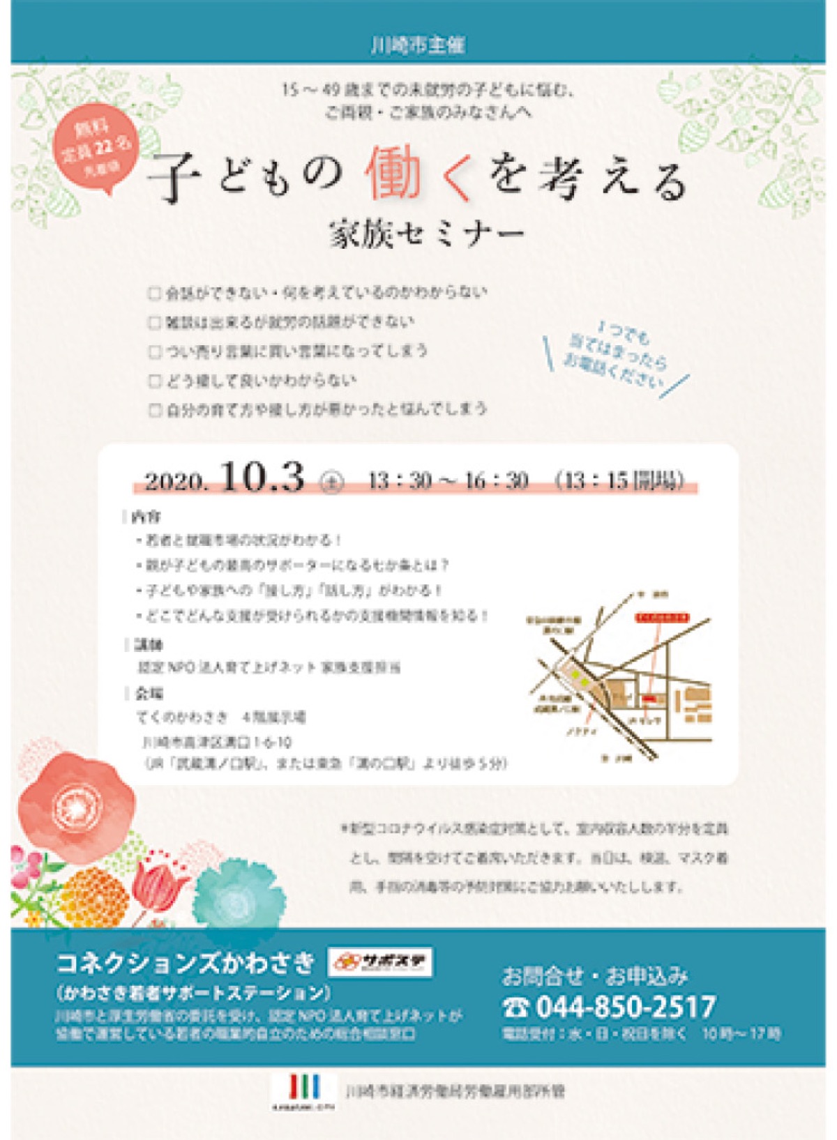 さらに未就労の子どもに悩む両親や家族向けの「子どもの”働く”を考える家族セミナー」を10月3日(土)に前出「てくのかわさき」で実施する。