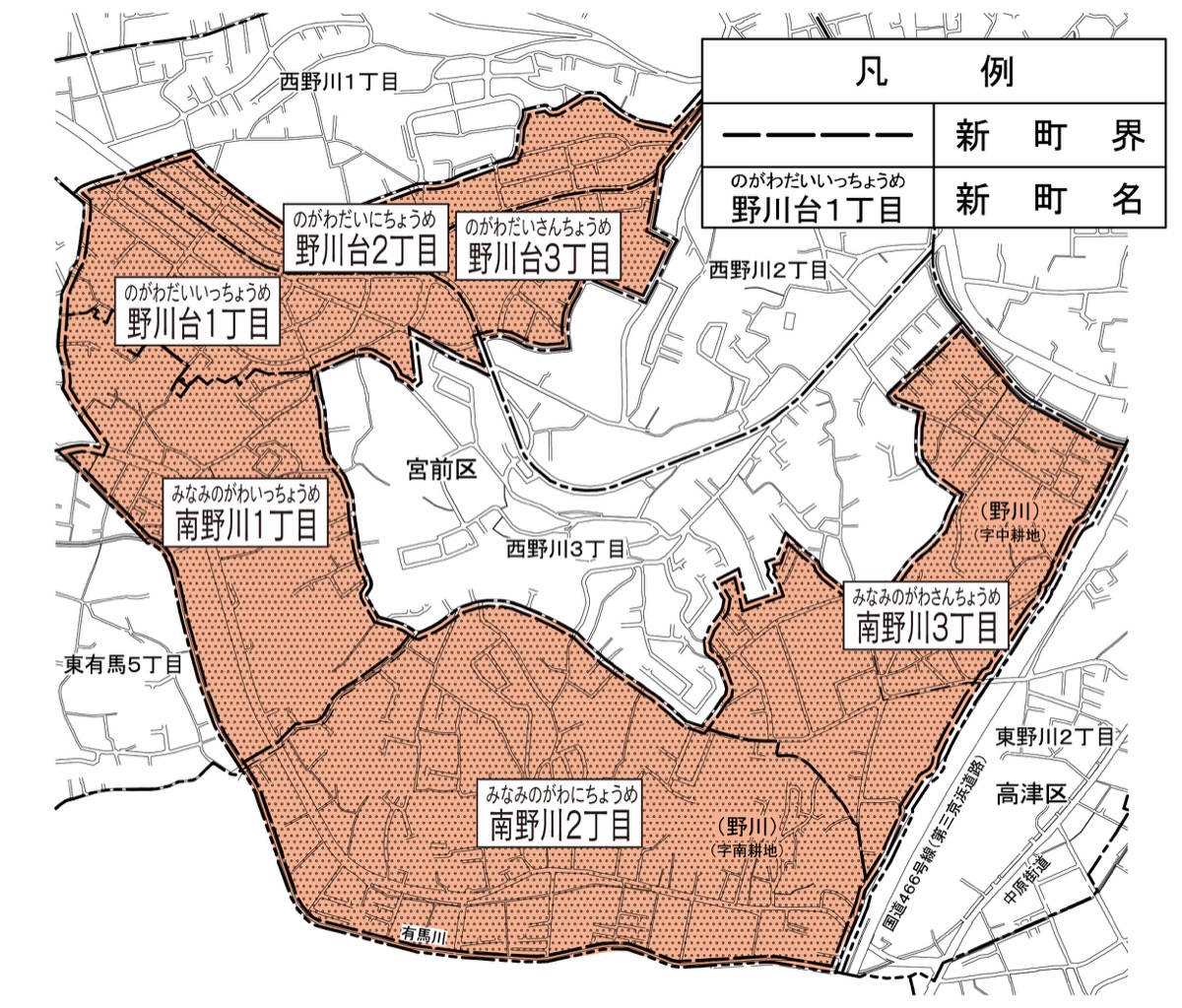全3回の変更で高津区「東野川」「北野川」、宮前区「野川本町」「西野川」「野川台」「南野川」の6町名が新たに誕生した。