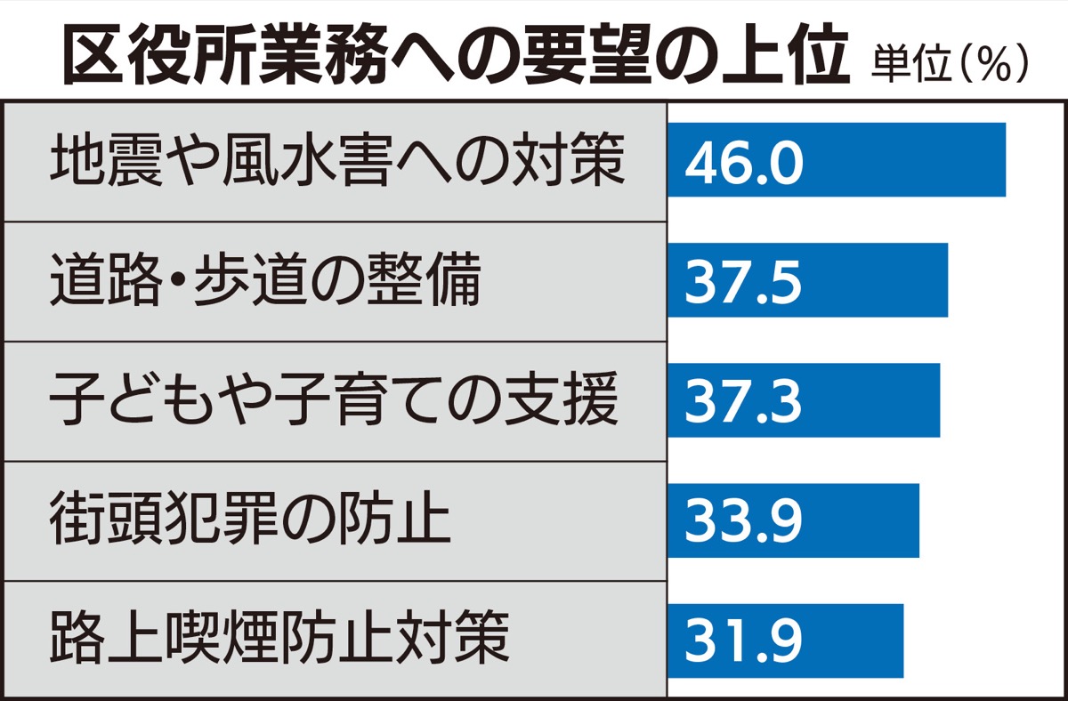 区役所業務への要望では1位が「地震や風水害への対策」(46%)で、令和元年東日本台風の影響もあったせいか、前回比6・3ポイント増。