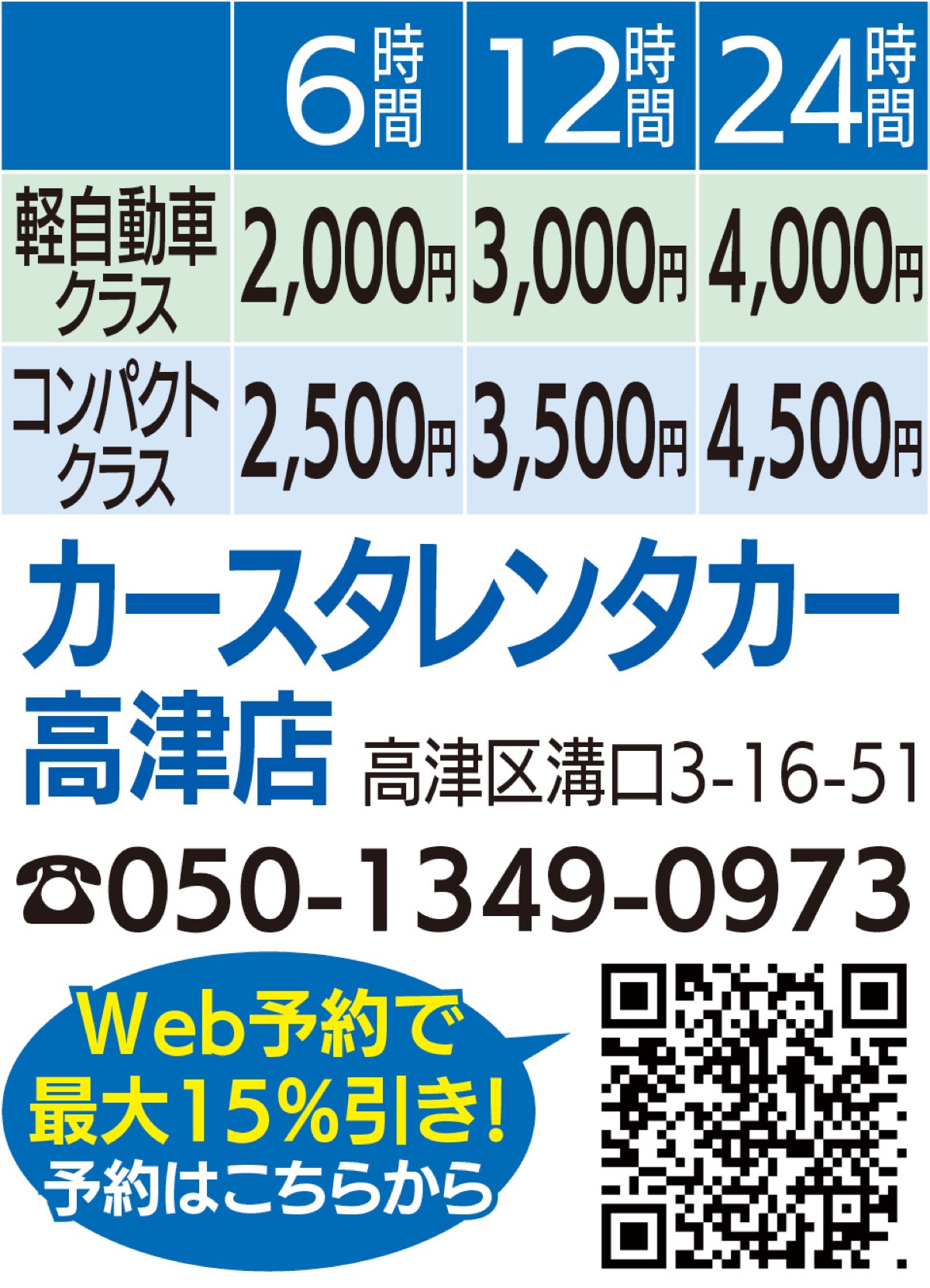 府中街道沿いの高津小近くに、カースタレンタカー高津店が4月6日にオープンした。軽自動車クラス6時間2千円〜というお手頃価格が評判で、すでにGWの予約がほぼ埋まっているという。「GW前後はまだ空きがあります。低価格・高品質のご提供をお約束します」と大石店長。