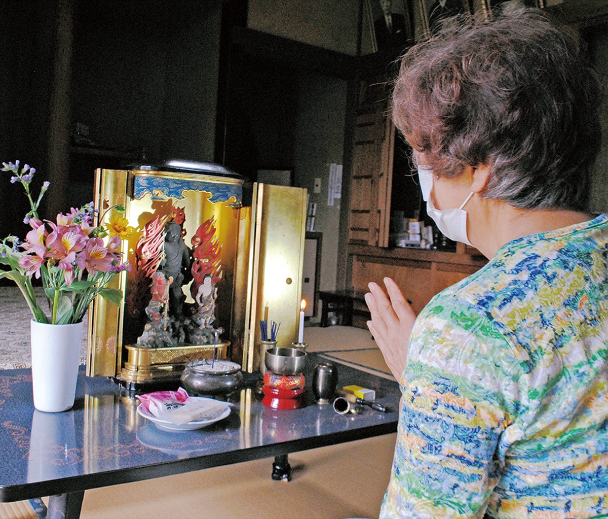 24日、梶ヶ谷の亀ヶ谷栄一さん宅に到着した不動明王像は、妻の悦子さんの手で迎え入れられた。悦子さんは花を供え線香を上げると「1年ぶりです。またお会いすることができて本当に感謝」と手を合わせた。昔は食事を用意し、送り込みに来た人の接待もしていたというが、今は玄関先での受け渡しのみに。嫁いで50年以上になり、親戚から「まだ続けているの」と驚かれることもあったというが「親の代から手伝ってきたので、今後もつなげていけたら」と話す。
