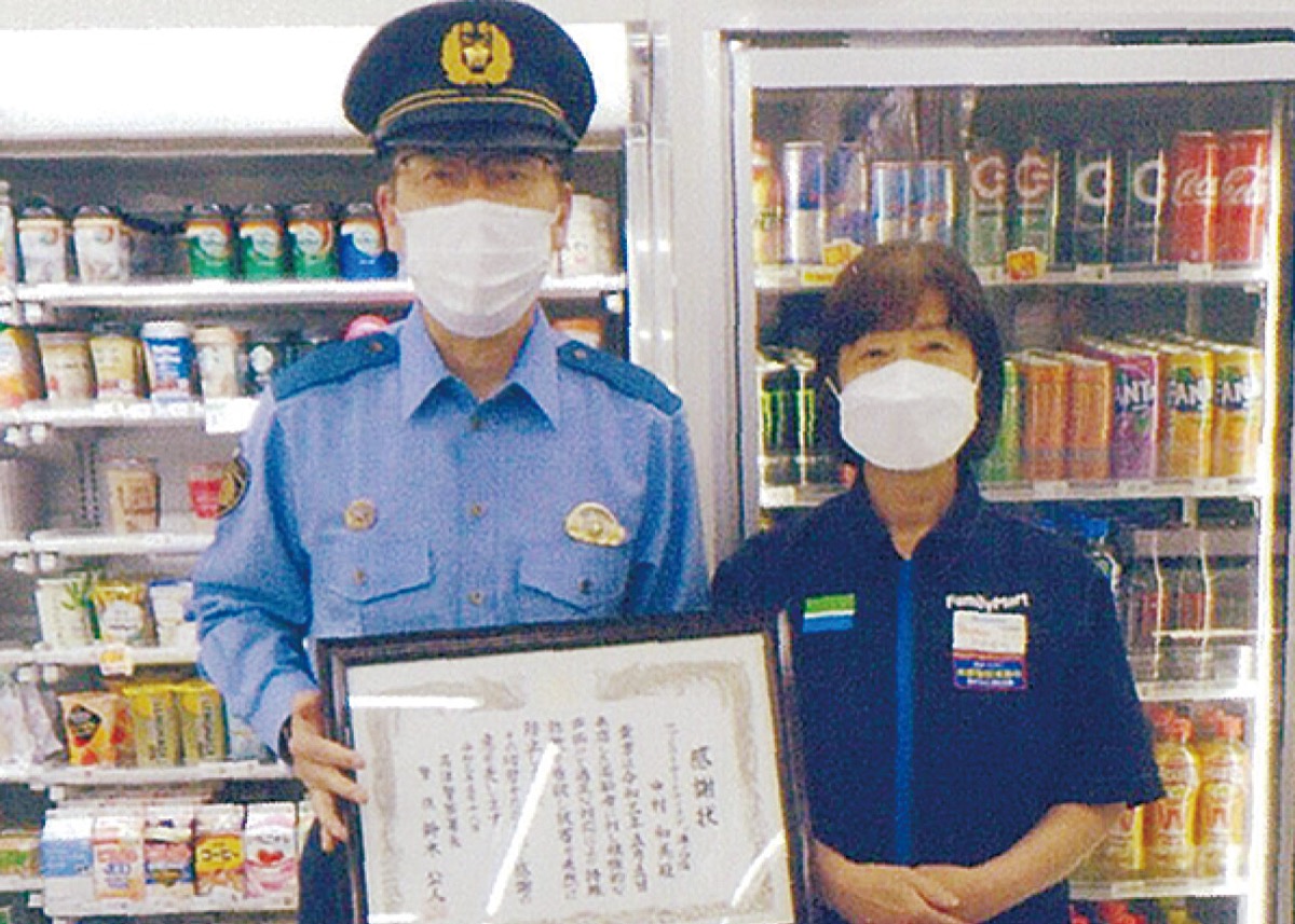 架空料金請求詐欺を防止したとして、ファミリーマートテイスティ溝ノ口店(久本)の店長代行・中村和美さんが5月18日、高津警察署の鈴木公人署長から感謝状を贈呈された。