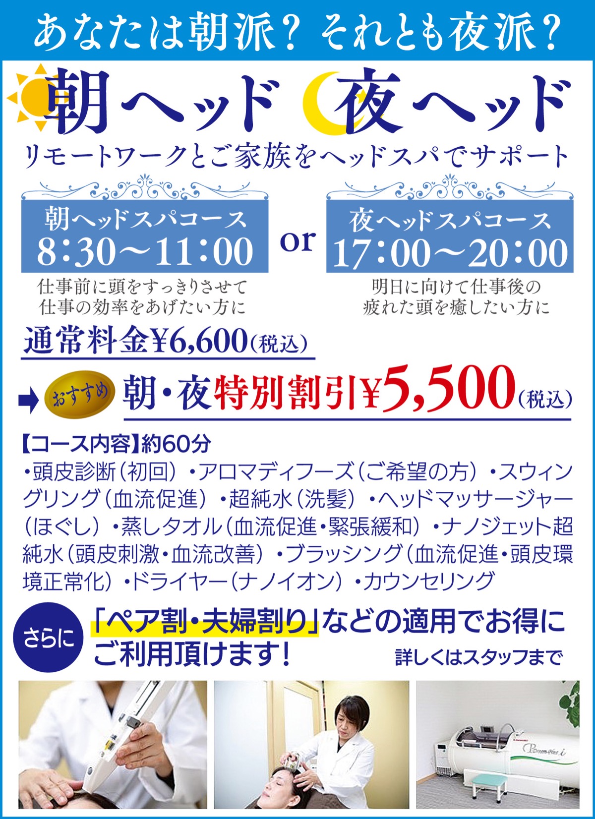 これは仕事前、早朝から利用可能でリモートワークの効率アップに最適な「朝ヘッド」(受付8時半〜11時)と、仕事疲れを癒して明日への英気を養う「夜ヘッド」(同17時〜20時)が、それぞれ特別割引料金で利用できるというもの。