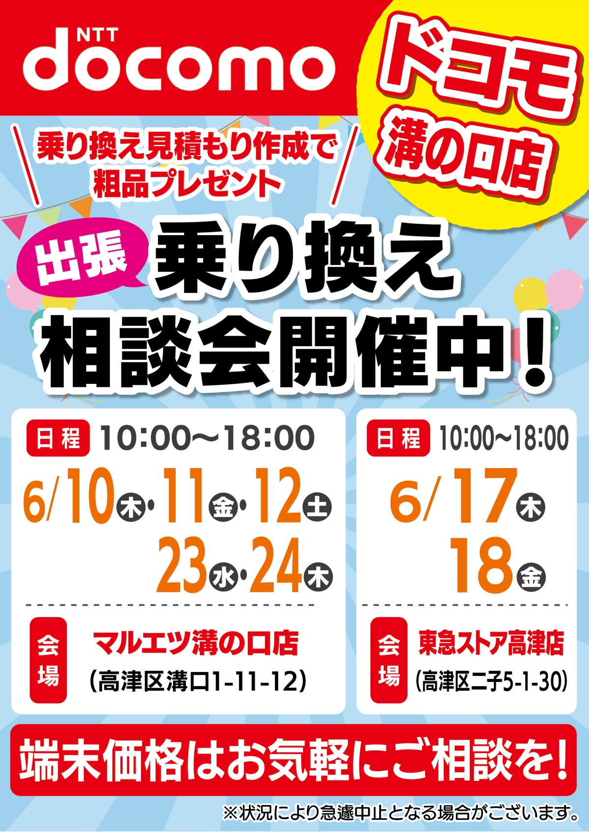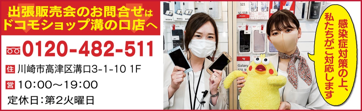 「スマホに変えたい」「毎月の料金が高い気がする」など、携帯電話やスマホの悩みがある人に朗報。マルエツ溝の口店と東急ストア高津店で、「ドコモショップ溝の口店の出張相談会」が開催される。日程は左記。