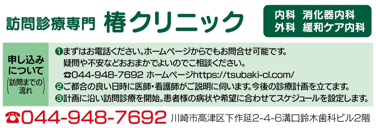 在宅療養支援診療所でもある当クリニックは、高津区や近隣を訪問エリアとし、患者様やそのご家族様からの要請に1年365日、24時間対応。できる限り速やかに往診が受けられる体制を整えています。また「患者ファーストな医療の実践」を標榜しており、訪問診療に特化したクリニックとして医師やスタッフが各家庭に出向き診療を行っています。さらに訪問先において処方箋を発行しますので、薬局へご家族の方が取りに行くこともできますし、配達を行っている薬局の紹介等も行っています。