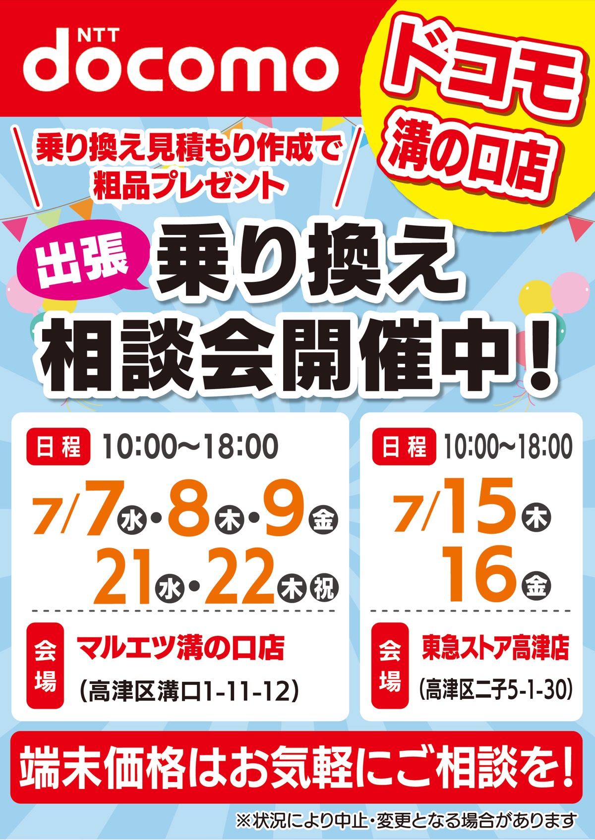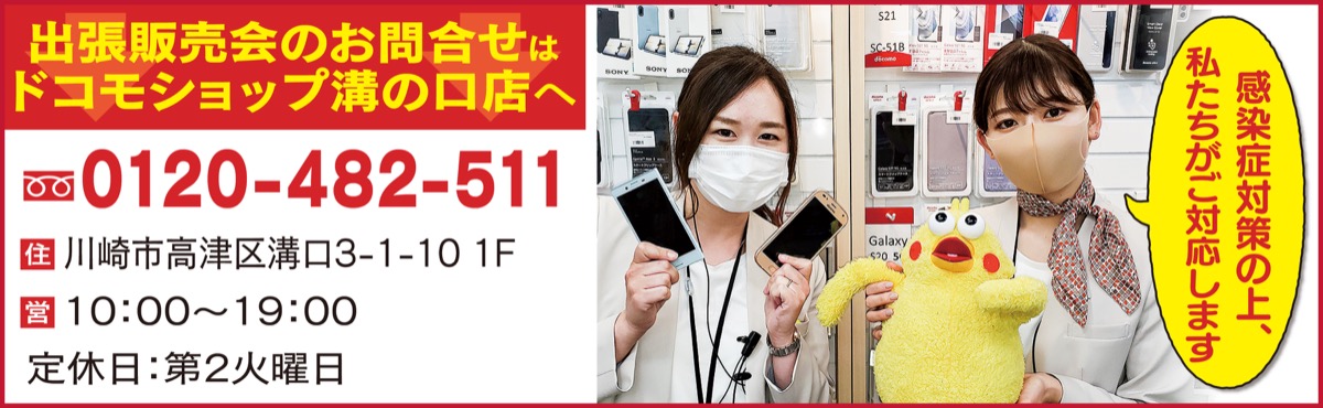 「スマホに変えたい」「毎月の料金が高い気がする」など、携帯電話やスマホの悩みがある人に朗報。マルエツ溝の口店と東急ストア高津店で、「ドコモショップ溝の口店の出張相談会」が開催される。日程は左記。