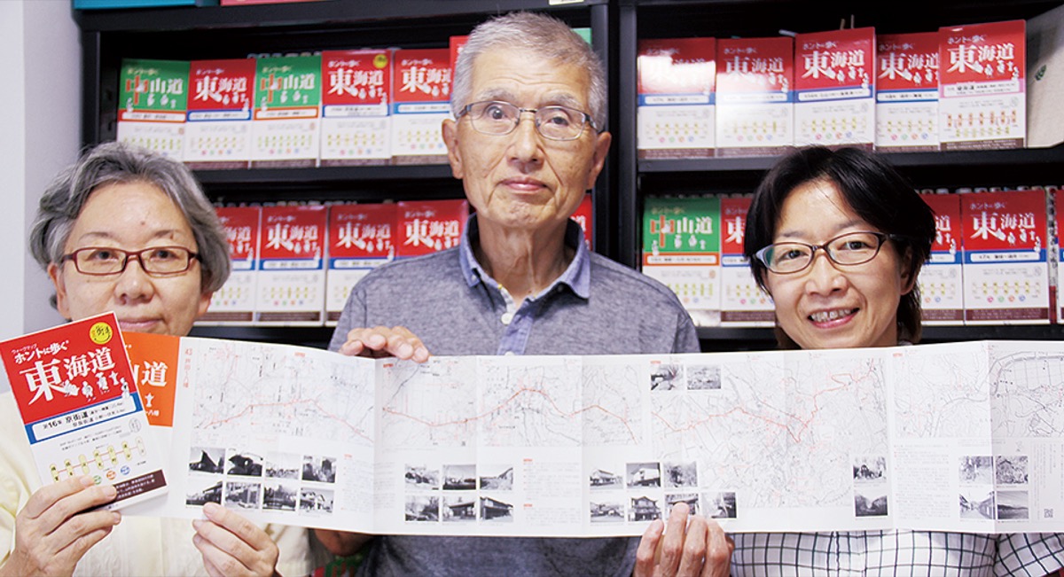 マップ展示「東海道・中山道・大山街道」は、コロナ禍で街道歩きなどが難しい今、地形図で歩く紙上の旅を楽しんでもらおうと「『ホントに歩く』ウォークマップ」を発行する風人社(東京都狛江市/【電話】03・5761・7941)が開催。同様の展示は藤沢市などでも開催しており、今回で4回目。実際に現地を歩いて作成しているのが特徴で、旧東海道に関しては全行程550キロを5年かけて調査したという。