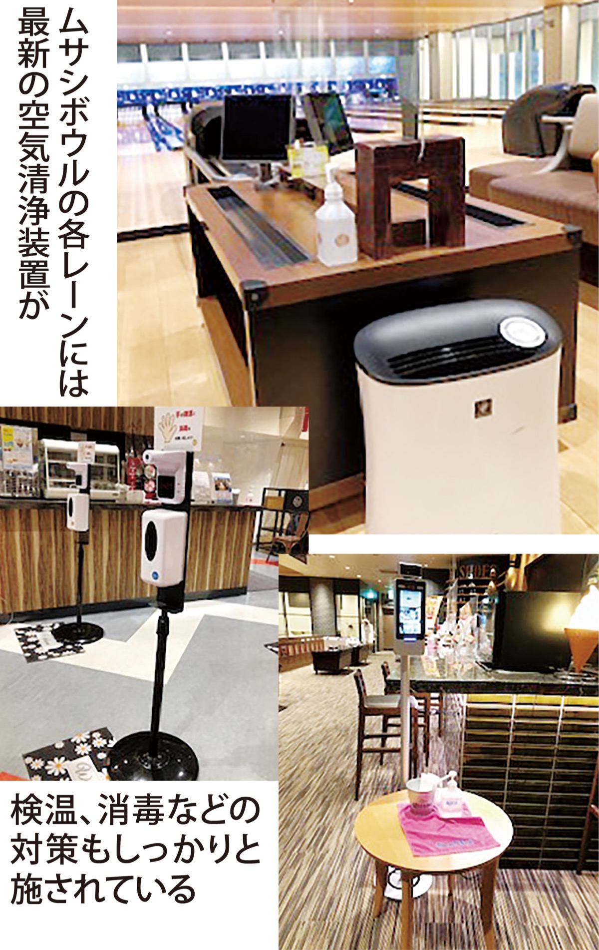 ムサシボウルも、このコロナ禍、スタッフ一丸となって感染症予防に取り組んでいます。前出のガイドライン遵守はもちろんの事、全席に空気清浄装置を設置し、場内の至るところに消毒液を設置しています。また、ご来場されたお客様に密にならず受付対応できるよう非接触型の検温装置を拡充するなど最善な体制を整えました。
