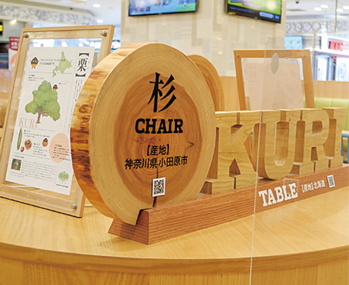 ウッドデザイン賞は木で暮らしと社会を豊かにする製品や取り組みを表彰し、木材の利用促進を目指すもの。受賞したフードコートは「FIND WOOD FOOD COURT」として(株)エイムクリエイツのプロデュースのもと昨年9月にリニューアル。「木の良さに気づく新・食空間」を掲げ、国産家具メーカーのワイス・ワイスによる北海道のナラと栗、九州の山桜とセンダンを使ったテーブルや小田原市の杉を使ったオリジナルチェアを設置している。この5種の国産木材に直接触れることができるほか、それぞれの木の特徴や用途を解説したポップを用意。特設サイトにつながる二次元コードも記載し、利用者が気軽に情報を得られるよう工夫している。運営するみぞのくち新都市(株)の石川雅道専務は「ノクティの柱の一つである環境への取り組みを認めてもらえてありがたい」と喜びを語る。