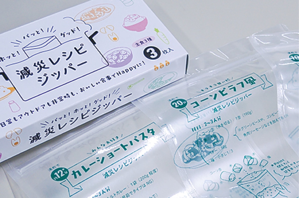 減災レシピジッパーは、食材を入れて湯煎するだけで料理ができあがるジッパーバッグ。袋自体にイラスト入りでレシピが書いてあり、簡単な工程で調理できる。開発したのはジッパーバッグを中心に日用雑貨品の開発や販売を行う(株)ショーエイコーポレーション=東京都。(一社)防災安全協会に所属し日用雑貨品の防災、減災への活用を進める同社が、溝の口減災ガールズ(山本詩野代表=人物風土記で紹介)に依頼し、共同での開発に至った。