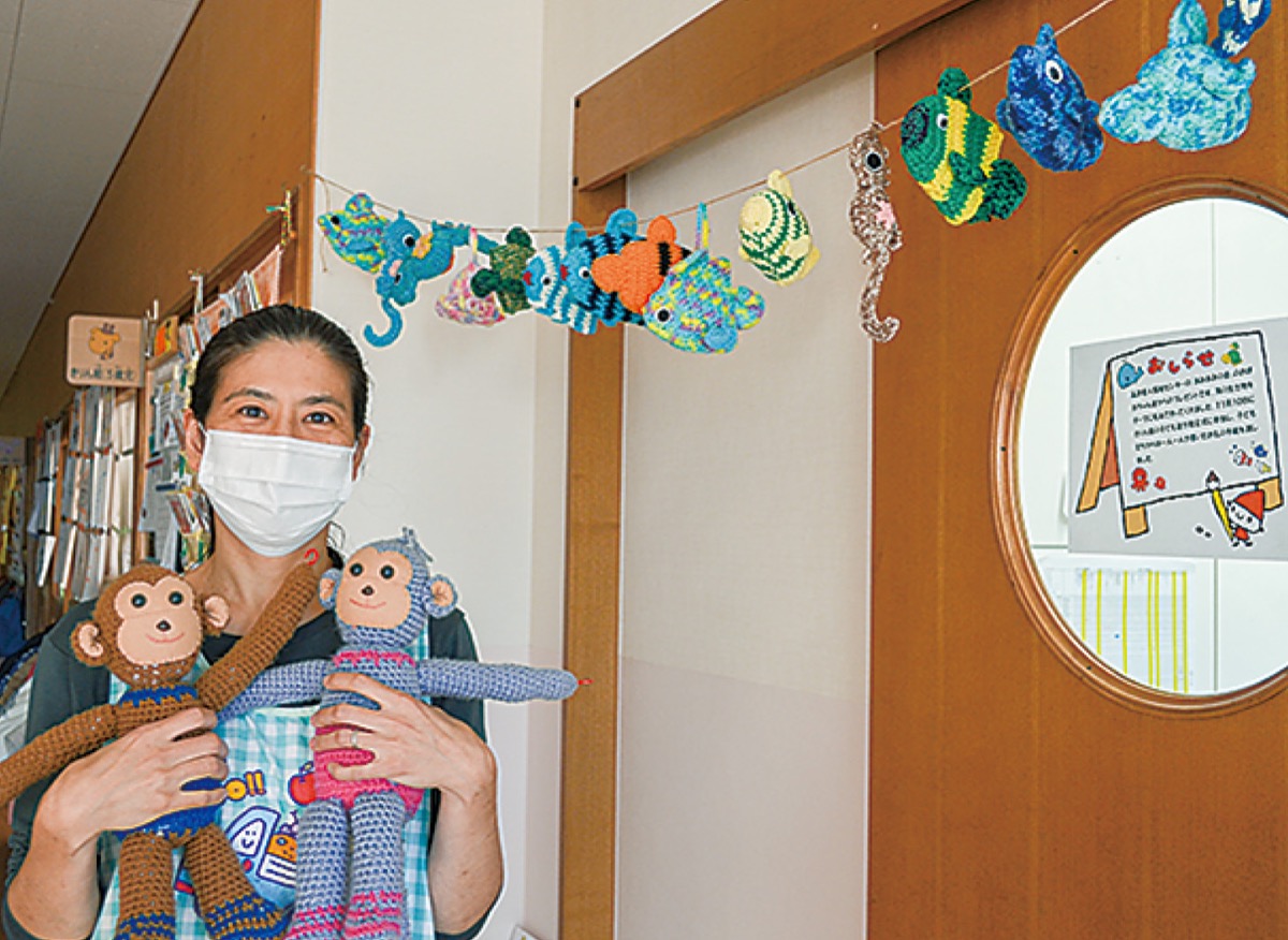 海の生き物や動物、人形などさまざまな編みぐるみ約120個は、高津老人福祉・地域交流センターを拠点に活動する「あみあみの会」(堀川節子代表)が寄贈したもの。同園の織田園長は「すばらしい編みぐるみをたくさん頂き、とても嬉しい」と笑顔を見せる。入口に飾っているのを見た園児や保護者からも好評のようだ。堀川代表は「子どもたちの成長を願いながら作った。贈呈式では子どもたちにも会えて、元気をもらった」と話した。