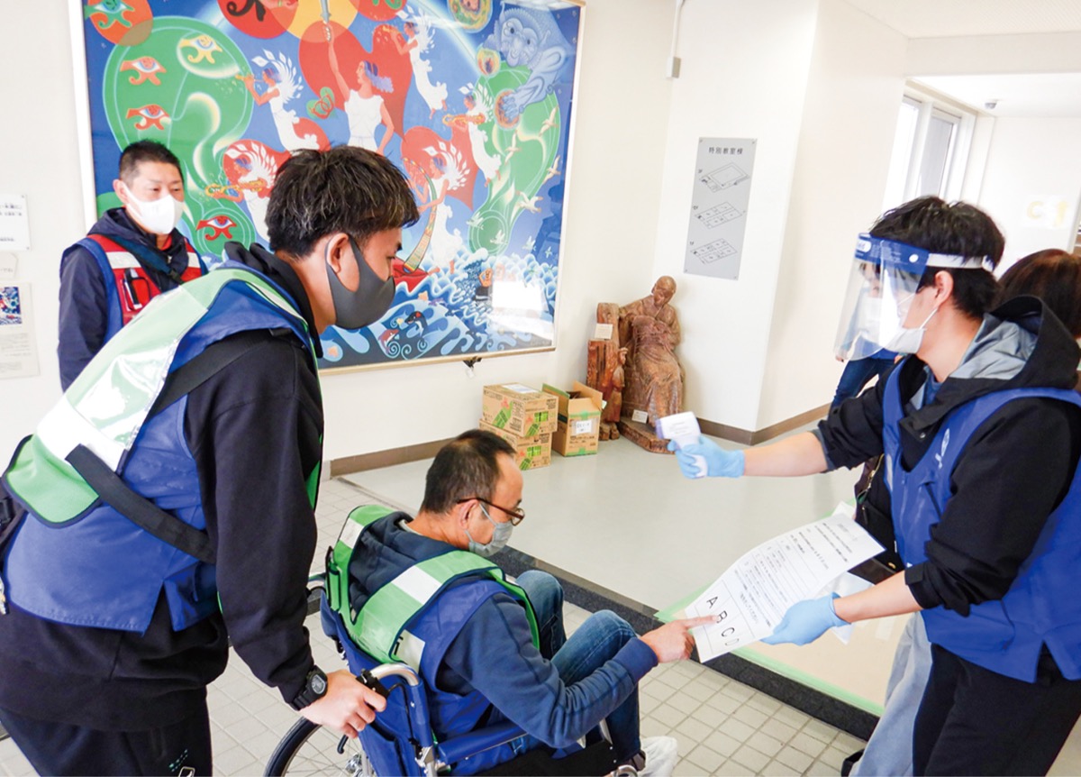 当日は、大型台風により多摩川の河川水位が上昇し、洪水発生の危険性が高まったことを想定。会場となった高津小学校では、午前8時30分から指定緊急避難場所としてその開設準備が開始された。会場では新型コロナウイルス感染症対策を踏まえ、健常者、要配慮者、体調不良者、濃厚接触者でエリア分けを行ったほか、風水害の想定のため、校舎の2階以上の教室を避難ゾーンとして設営。避難者には受付で検温や健康チェックシートによる体調申告をしてもらい、専用スペースに振り分け、動線を分けるなど、接触しないための工夫もとられた。避難者にはマスク着用や手指消毒、大声での会話自粛などの感染対策も呼びかけた。