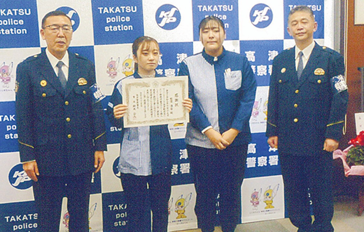 高津警察署(鈴木公人署長)で12月1日、架空請求詐欺を阻止した功労者として、ローソン・スリーエフ高津駅前店の従業員・松窪清香さんと土屋真央さんに感謝状が贈呈された。