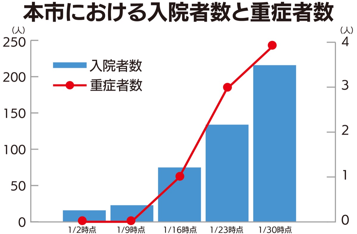 他方で「オミクロン株は重篤化しにくい」との報道もあります。下記のグラフは、本市における入院患者数と重症患者数の推移を示したものです。1月30日時点の入院患者数は216人ですが、人工呼吸器やECMOが必要な重症患者数は4人に留まります。ちなみに、前回、第5波ピーク時は、入院患者数286人、重症患者数68人にのぼりました。確かに今回の第6波では、重症患者数が増えにくい傾向を示しています。