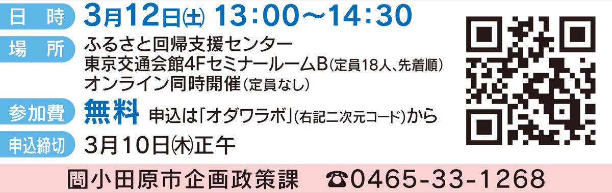 小田原市での暮らしの魅力を先輩移住者が語ってくれるイベントが3月12日(土)、ふるさと回帰支援センター(有楽町駅前)とオンラインで同時開催。一昨年6月から社会増の傾向が続く小田原市。移住者は何を見て、何を感じているのか。