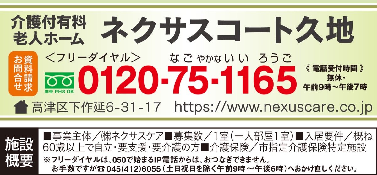 竹林を背に、モダンで落ち着いた雰囲気が印象的な介護付有料老人ホーム「ネクサスコート久地」。久地駅・津田山駅から徒歩7分の場所で、心地よい安らぎの住空間を提供している。