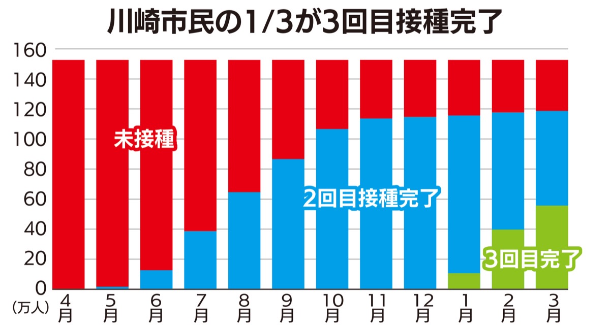 下記のグラフは、本市におけるワクチン接種状況を示したものです。3月末の時点で、市民全体の概ね1/3が3回目の接種を完了していますが、2回目接種と比べると、明らかにペースが緩やかです。