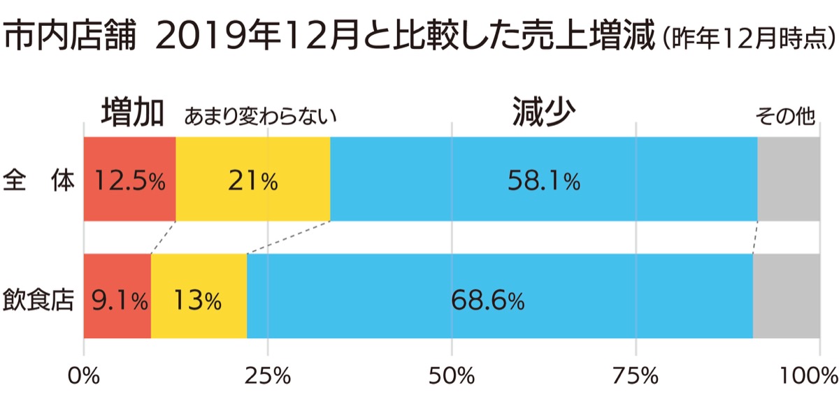 コロナ禍の来客数や売り上げの増減については、2019年12月との比較で、20年12月と21年12月ともに減少したとの回答が55%超。業種別で見ると、飲食店では減少の割合が68・6%と他の業種より10%以上高く、大きな影響を受けたことが分かった。