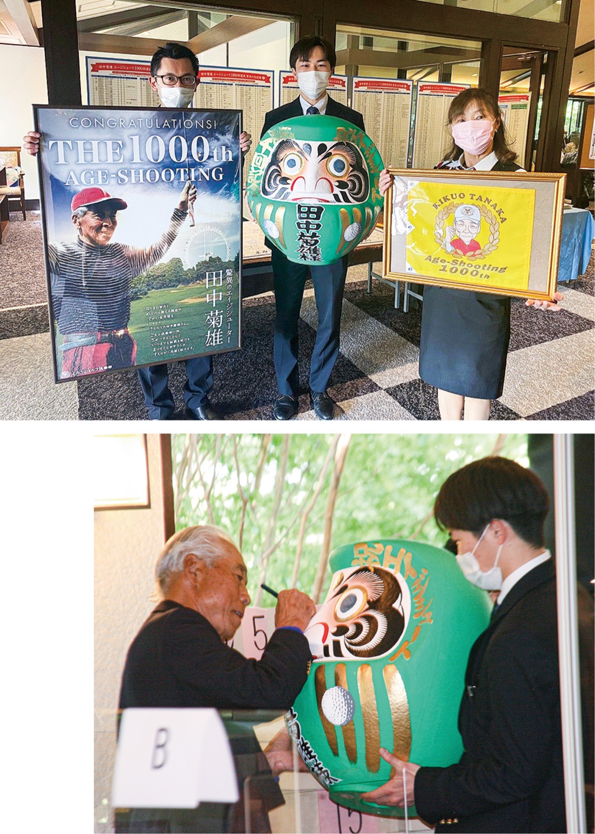 そんな中、催しのホスト役でもある田中会長は自身のプレー後、マスター室前にて待機。最終組がプレーを終えるまで参加者を迎え言葉を交わすなどサービス精神を存分に発揮。表彰式を兼ねたセレモニーの中では、ゴルフ場スタッフから緑色の大きな達磨が贈られ、記録達成を祝し目入れを行うと、大きな拍手が沸き起こっていた。