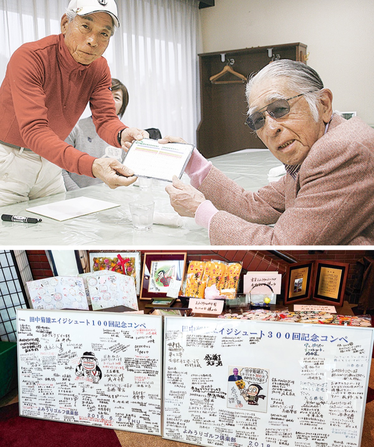 会場となった「よみうりゴルフ倶楽部」はAS1000回目の快挙を達成しており、またコース別の内訳でも最多となる587回のASをマークするなど、ゆかりのあるゴルフ場。当日は晴れの舞台に華を添えようと、貸切りとなった会場玄関には特製ポスターが飾られ、各ホールのピンフラッグが田中会長の似顔絵のデザインになるなど、祝福ムード一色といった様相。クラブハウスには1000回達成までの軌跡などがボード掲出されたほか、これまでのスコアカードの実物展示も行われた。さらに、田中会長とは20年来のゴルフ仲間で、4月7日に亡くなった漫画家の藤子不二雄(A)(安孫子素雄)氏を偲び、直筆の色紙やメッセージボードを展示する一画も設けられた。