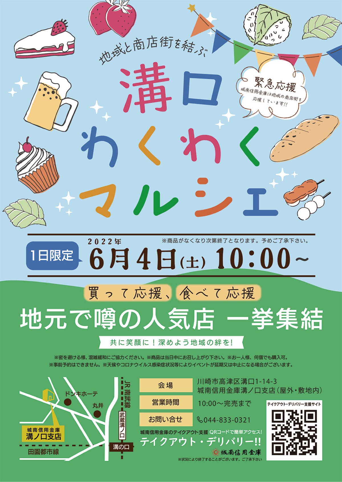 「地域と商店街を結ぶ『溝口わくわくマルシェ』」と銘打たれたこのイベントが6月4日(土)、1日限定で実施される。企画したのは城南信用金庫(川本恭治理事長)。当日は同支店(溝口1の14の3)を会場に、高津区内外の人気店などが一堂に集結。「買って応援、食べて応援」をキャッチフレーズに午前10時から計12店の出展ブースを見て回る事ができる。またこの催しには溝口中央通商店会や溝ノ口駅前商店街振興組合、北見方町会等も協力。溝ノ口支店の五ノ井英夫支店長は「高津区界隈が一丸となり共に笑顔になれるような1日になれば」と話し、多くの来場を呼び掛けている。