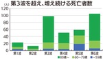 下記のグラフは、新型コロナウイルス感染症による死亡者数の推移です。「オミクロン株」は重篤化しにくい傾向はあるものの、いまだに日々500人前後の方々が新規感染しており、死亡者数もジリジリと増え続けています。すでに、第6波における累積死亡者数は、過去最多となった第3波を超えており、今後もさらに増え続けていくと見られています。