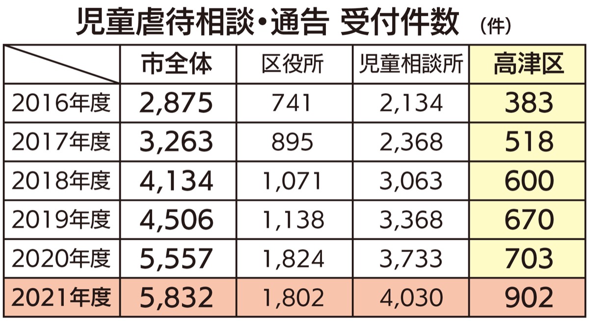 年齢別では、就学前までの乳幼児が3232件(135件増)で半数以上。主な虐待者別の構成比は実母が56・7%、実父が39・1%だった。区別では川崎区が最多の1243件で、高津区は3番目に多いの902件(前年度比199件増)だった。