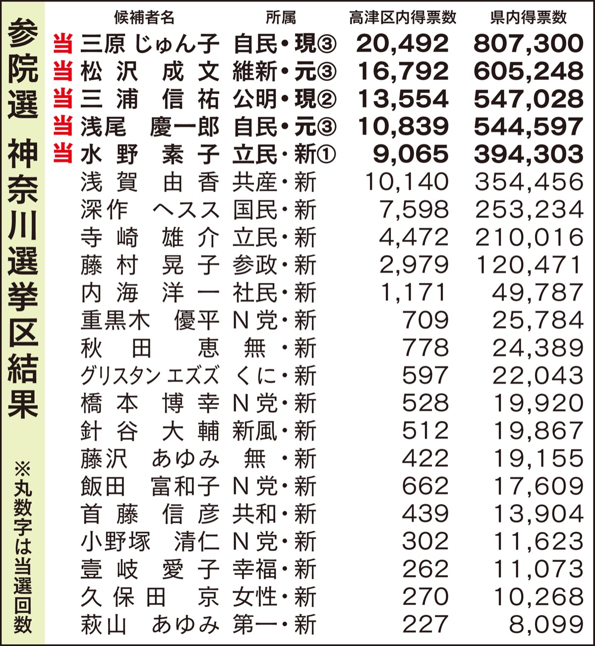 参議院議員選挙の投開票が7月10日に行われた。改選4と欠員補充1の計5議席を過去最多の22人で争った神奈川選挙区は、自民党の現職・三原じゅん子氏(57)が約80万7千票を獲得し、トップ当選。以下、日本維新の会の元職・松沢成文氏(64)、公明党の現職・三浦信祐氏(47)、自民党の元職・浅尾慶一郎氏(58)、立憲民主党の新人・水野素子氏(52)が当選した。