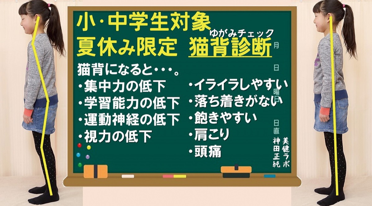 そんな中、骨盤矯正などを中心に高津区民のライフスタイルをより良くするための独自施術を提供する「美健LABO K-Style」(神田正純院長)では、地元の小・中学生を対象とした「猫背チェック&姿勢診断」を企画。「視力低下に限らず姿勢の崩れは様々なシーンに影響します。夏休みにお子様の姿勢を考えませんか?」と呼び掛けている。