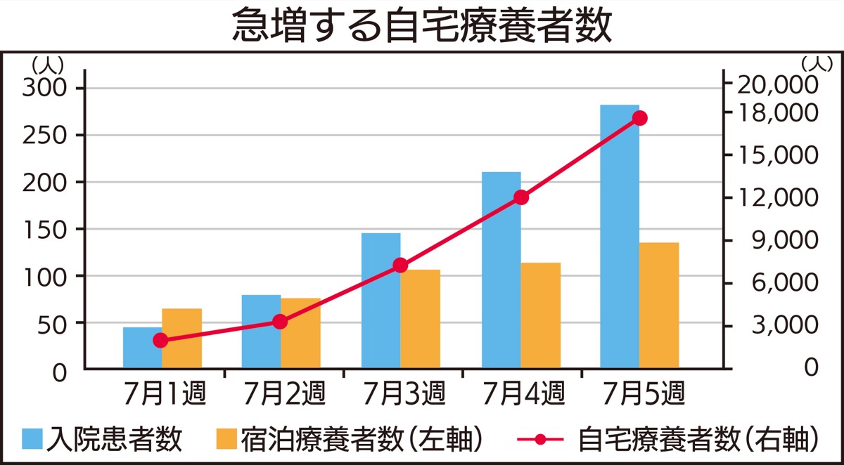 下記のグラフは、川崎市における自宅療養者数の推移を見たものです。7月に入ってから急増し、月末には1万8千人を超えています。注意すべきなのが、この人数は医療機関で診断を受けた方だけの数であり、神奈川県が対応している約1万人の「自主療養届出者」数は含まれていないことです。自主療養届出者の多くは、発熱外来にアクセスすることができず、自身で感染確認をした方々です。すでに発熱外来はひっ迫状況にあると言わざるをえません。