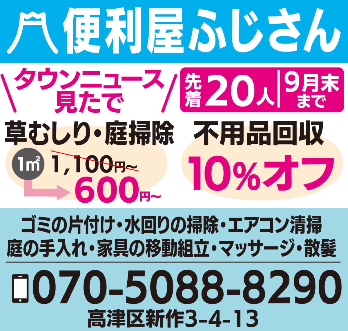 草むしりや不用品回収など暮らしの「困った」があったら「便利屋ふじさん」へ。高津・中原・宮前を中心に地域密着で迅速・親身な対応が評判だ。地元で整骨院や訪問マッサージ、障害者施設などを運営する代表の藤井さん。日常の困りごとにも対応しようと昨年4月、便利屋を開業した。