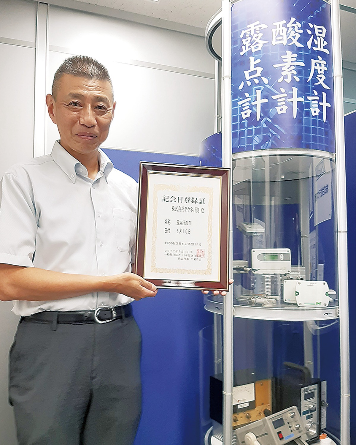 しかし日常生活の中でこの露点計を使用する場面は少なく「認知度はまだまだ低く、どのように役立っているかもあまり知られていないのが現状」(永谷代表)。そこで、社員から記念日による認知度アップの妙案が持ち上がり、数カ月の準備期間を経て「一般社団法人 日本記念日協会」に申請。これが程なく正式に認定され先月「登録証」が届けられた。今後は、よく知られている他の記念日と同様に「6月10日は『露点計の日』」として協会HP等を通し広く周知されるという。